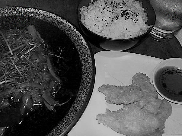 The ‘stir’fry’ – or Pork Shogayaki to give it its proper name – was exactly what was needed. Paper thin slices of deeply flavoured belly pork, cooked with ginger, carrot batons and yellow courgette strips. I only had my phone with me so you get to have a moody black and white shot instead of the full on autumnal effect of the dish. It was covered with shredded, deep fried crispy spring onions which added a nice crunchy texture and another layer of flavour.