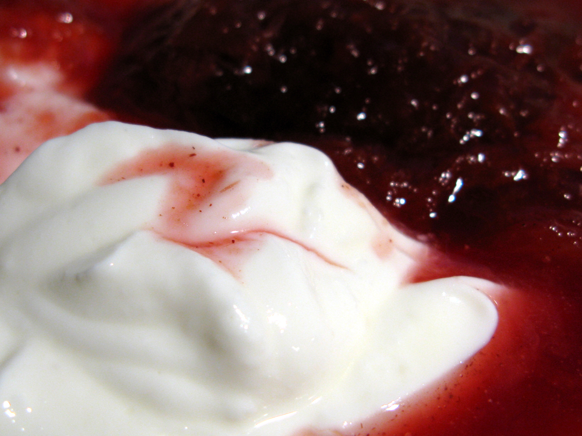 The full fat got used as a dessert. Yes, yes, I know, fruit with yoghurt how inspired but this was served with a compote of the lovely British red skinned, yellow fleshed plums that are currently in season, cooked down with brown sugar and cinnamon, and served over a bed of yoghurt. It worked very well indeed with the sweet but sharp plum compote, and all the bowls came back cleared.