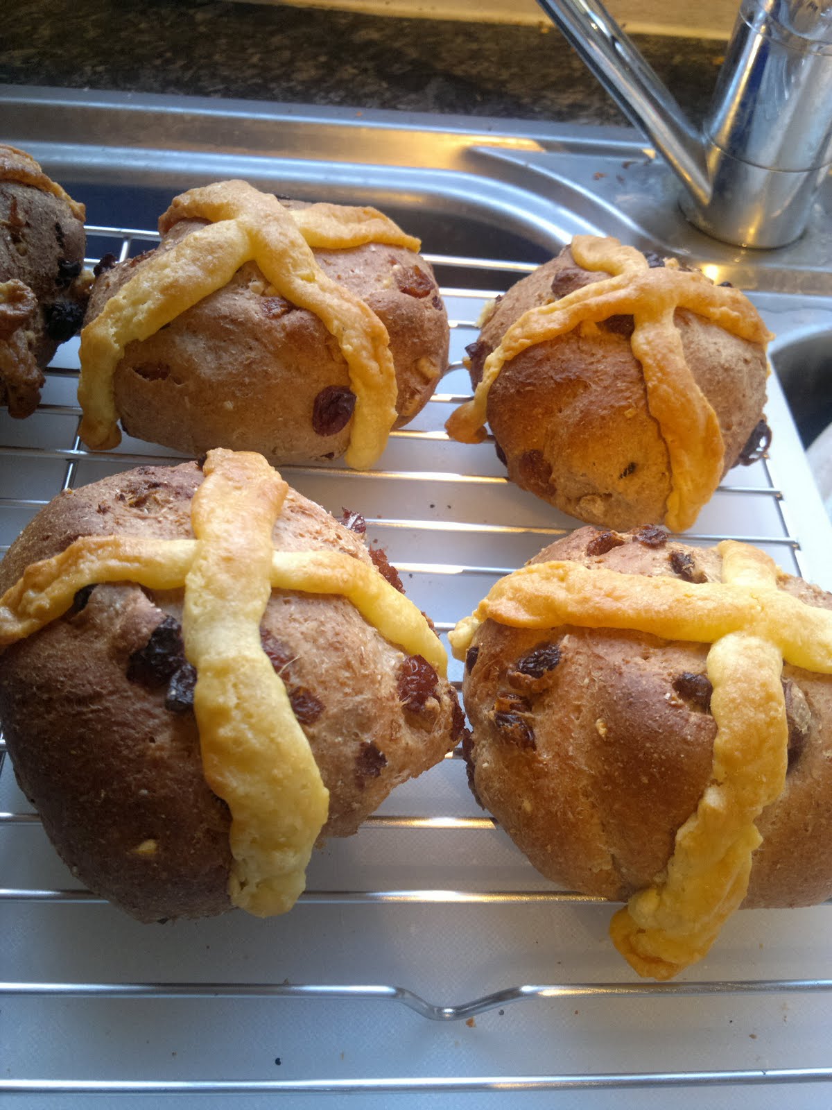 I made the cross mixture up in a small ramekin, tipped it into a small ziplock bag, twisted it up into a cone, snipped the corner off and rather inexpertly piped on the crosses.