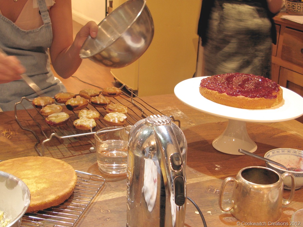 While the scones were cooking and the pastry cases cooling we whipped up a Victoria Sponge with raspberry jam and buttercream and then moved back on to the Bakewells. At least I think that was the order, but to be honest, it was loud, fun and happy chaos so I don’t care if I have got the cooking order wrong!
