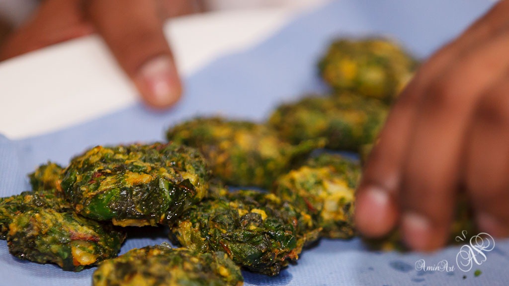 The aubergines are made into a pocket, stuffed with deliciousness, and then dipped in a gram (chick pea) flour batter and deep fried. Best savoury doughnut EVER as far as I am concerned. I’m going to get me some gram flour I think. The nice man also let me and another invader eat some of the crispy bits that had collected in the draining tray.
