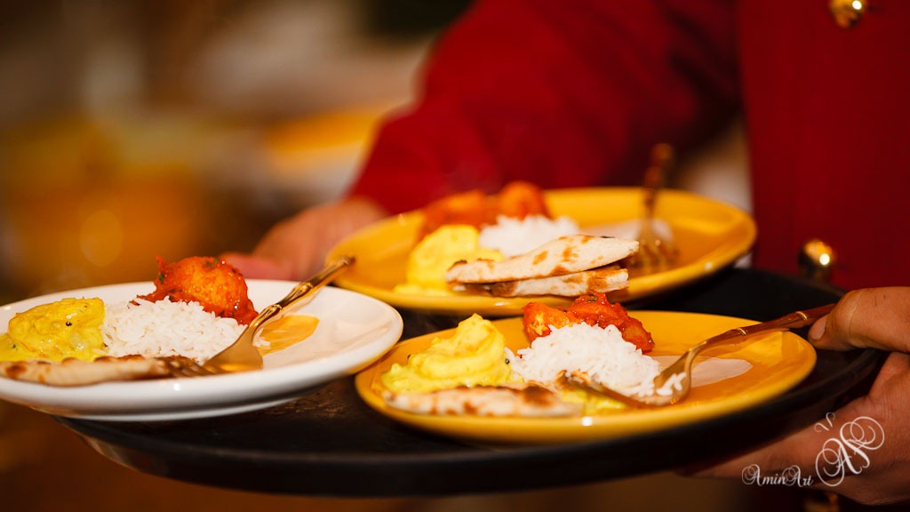 The finished taster plates of Chard and Water Chestnut Pakoras, Bombay Potatoes, Crevette Assadh, fluffy rice and naan.