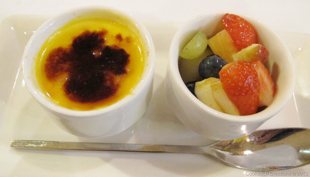 Dessert arrived. Saffron, ginger and cardamom creme brulee with fruit salad.