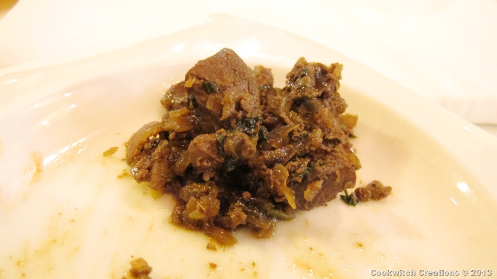 Next up were the turkey livers. They are dark, stronger in flavour than chicken livers and more firm in texture but very good indeed. He cooked them quickly in a dry curry style, and I could cheerfully have eaten them wrapped in some bread with chutney.