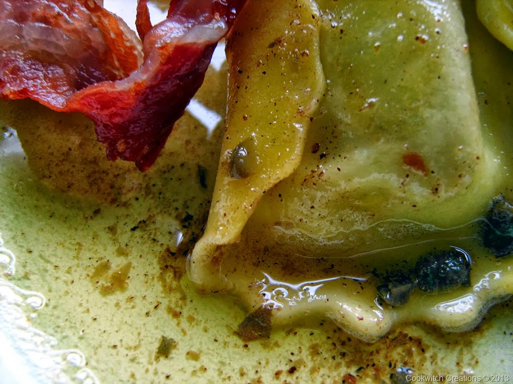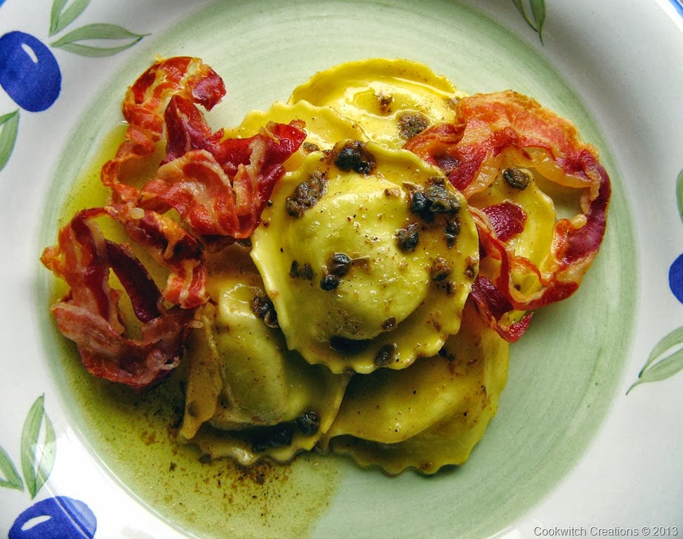 As a result of yesterday’s Foodie Fest, I had some salted capers and pancetta to use. I also had fresh pumpkin ravioli.