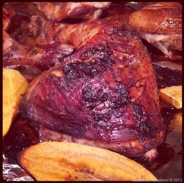 I poured it over 4 large thigh+leg portions that I’d slashed. I kept the skin on because, well, because chicken skin!