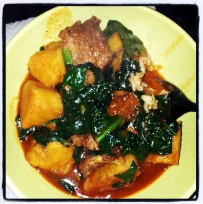 After three or four hours the meat should be tender. Peel the sweet potato, cube and add to the curry. Cover and cook for half an hour or until the potatoes are soft, then uncover and add the chopped spinach.