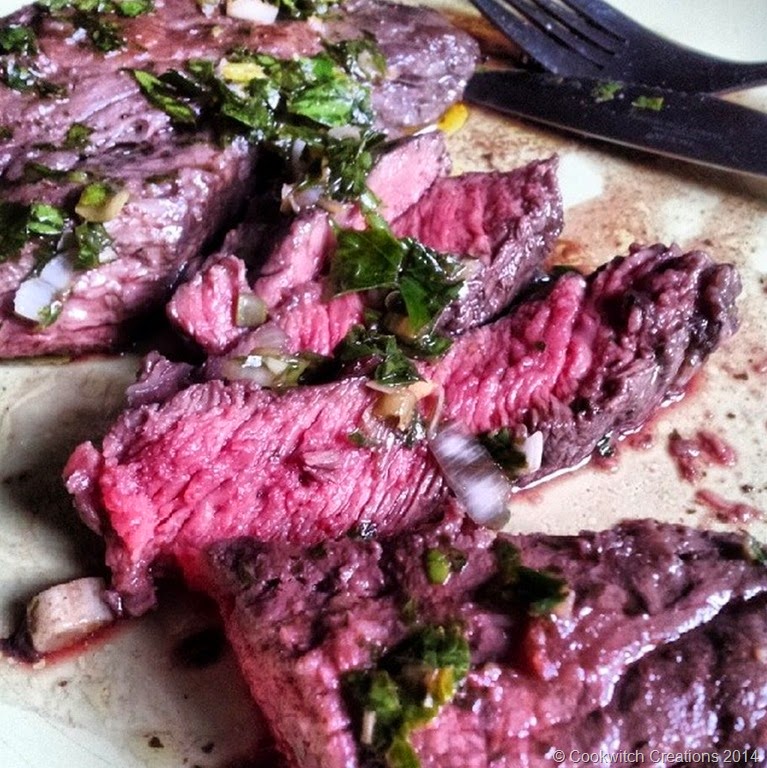 Cook on a searing, smoking hot griddle for 3 minutes per side. Serve with chimichurri sauce.