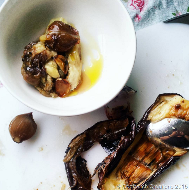 Once the aubergine had cooled down enough to handle, I scraped all of the soft flesh out into a bowl, and mashed it together with the soft pulp of the garlic and the shallot.