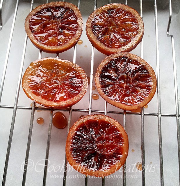 Take the slices out, and drain them on a rack. They will shortly become the stickiest thing known to man, and adhere to knife blades, fingers, non stick foil and you. They are also delicious. I tasted a bit of the syrup they were cooked in and actually did a little shimmy it was so good.