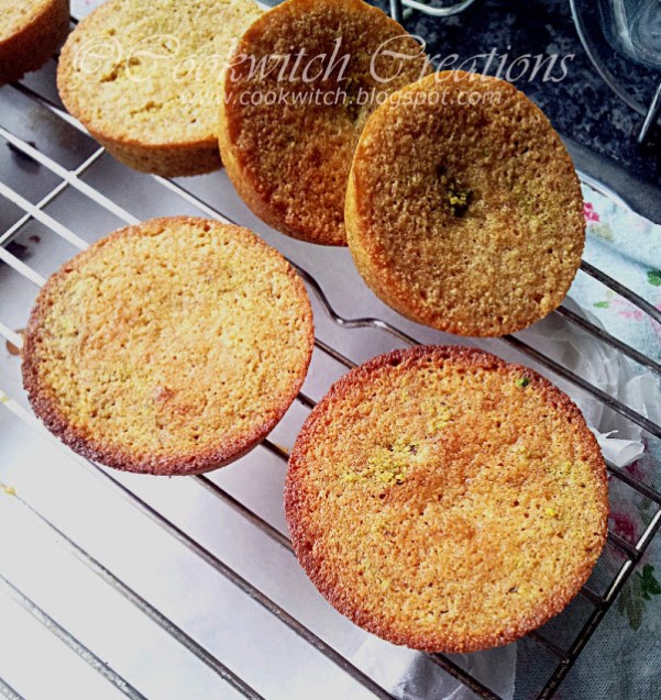 A rounded dessertspoon of the mix got dropped into silicone muffin moulds that I’d sprayed with non stick baking spray, and I sprinkled some of my ground pistachios on top.