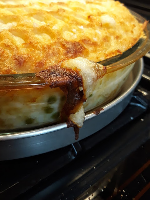 Stand your dish on a baking tray in case of overbubble, and bake in a `180C oven for about an hour, or until the potato goes golden.