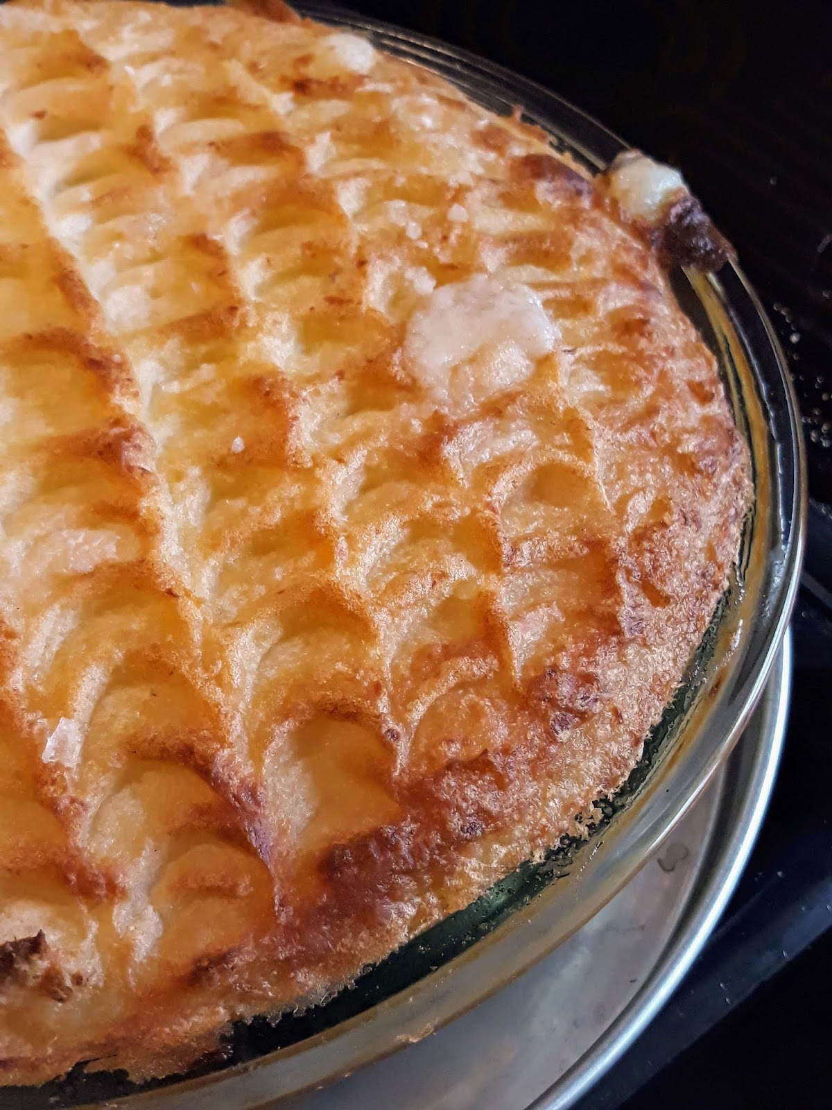 Stand your dish on a baking tray in case of overbubble, and bake in a `180C oven for about an hour, or until the potato goes golden.