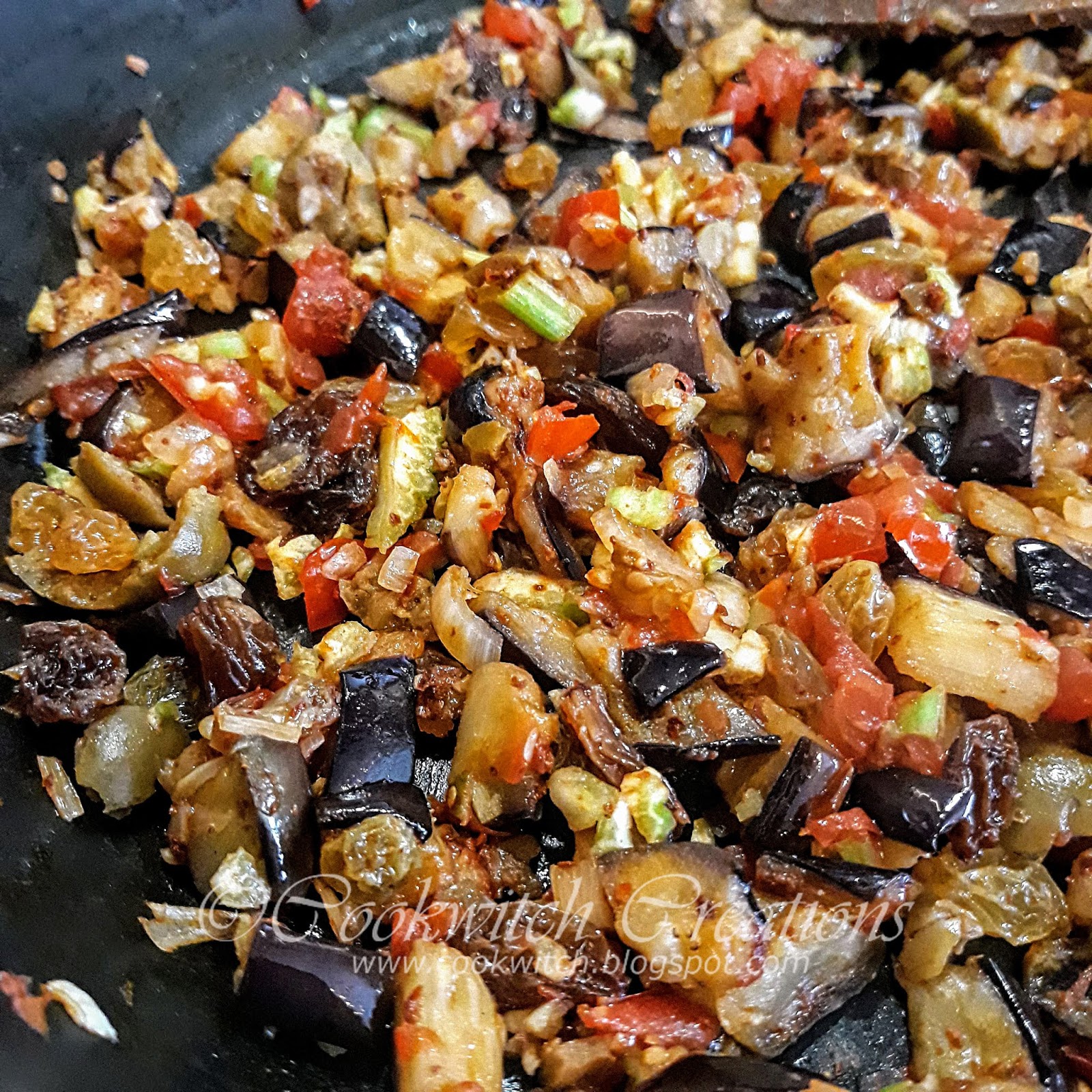 Put the spring onion in, cook for another 5 minutes just to take the rawness out, then add in the diced tomatoes, celery, sultanas, olives and vinegar.