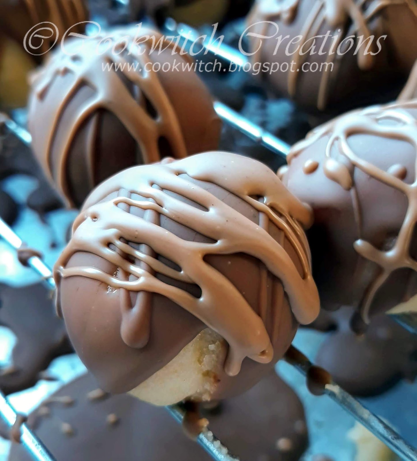 Melt the second lot of white chocolate, and pour a spoon over each ball. Don’t use it all up though, if you want to decorate further. My chocolate skills consist of ‘blob it all on and see what happens’ so just go for it.