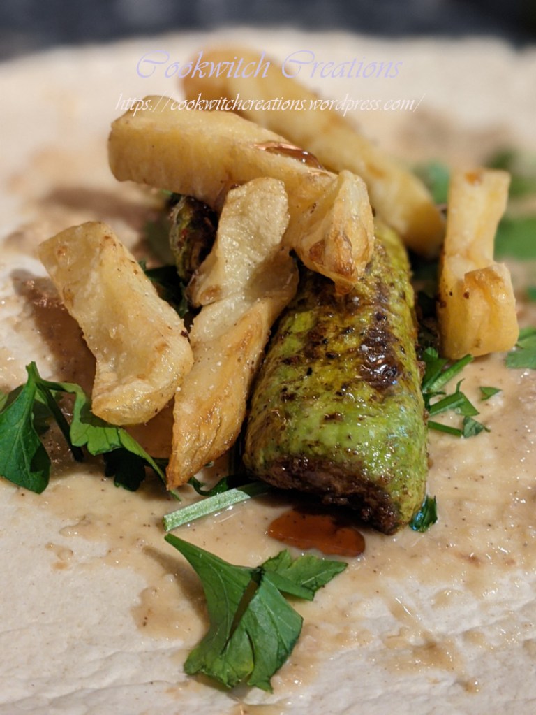Once they are cooked to your liking, dress them with olive oil and fresh lemon juice while they are still hot. You can wrap them in flat breads with tahini and herbs, or do a take on an Athenian gyro like I did (added chips) or just eat them as part of a big, fresh salad. It’s your dinner, so it is totally up to you!
