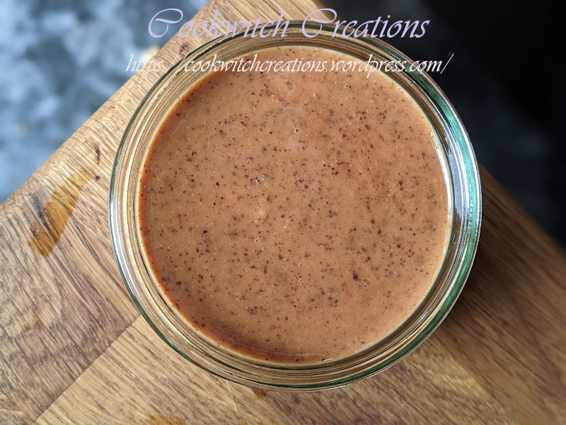I ground up the peanuts first – pulse them so you don’t get peanut butter too soon – then add in the mustard seeds. Quick few pulses, then add in the garlic, salt, maple syrup and miso. Grind again, and if it is too thick to pour add in 2 tbs warm water. (Initially I mashed the garlic and salt first, then stirred in the miso, until I realised that Duh. GRINDER.)