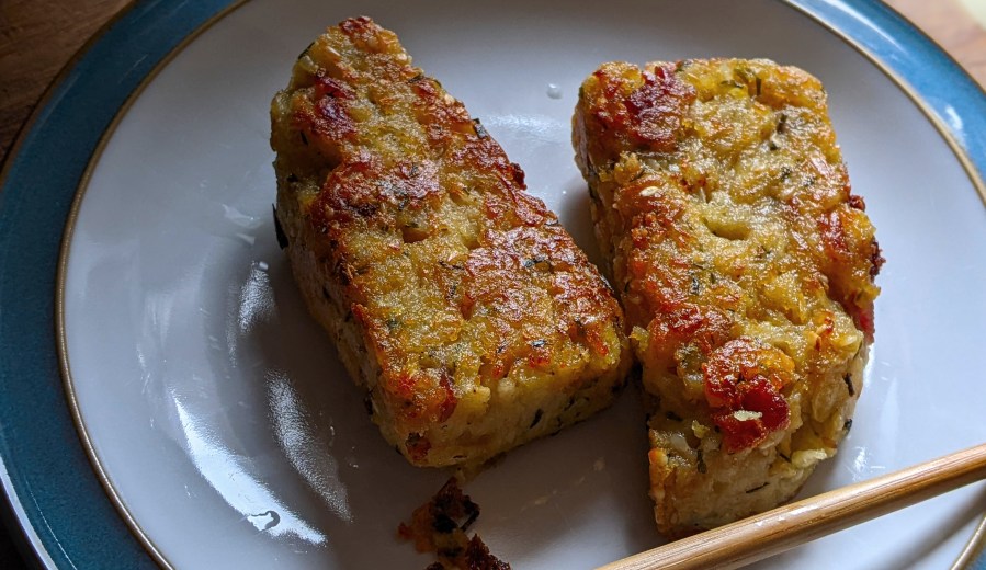 The next day, you can slice it and eat it as it is, like a delicious savoury pudding, or slice it and fry on all sides until crisp and golden. I suspect it would be fab alongside some crispy bacon and fried eggs!
