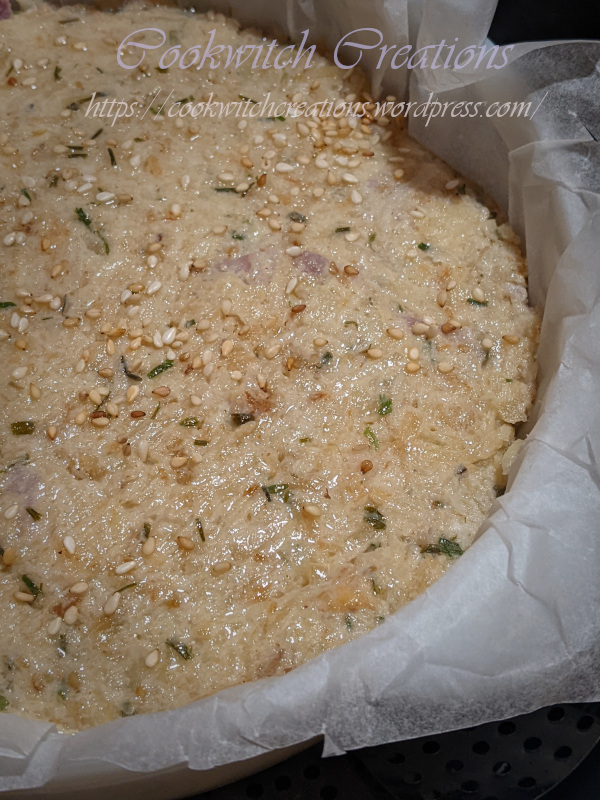 Pile it into your prepped dish of choice, lightly brush some vegetable oil on the top and sprinkle a few more sesame seeds.